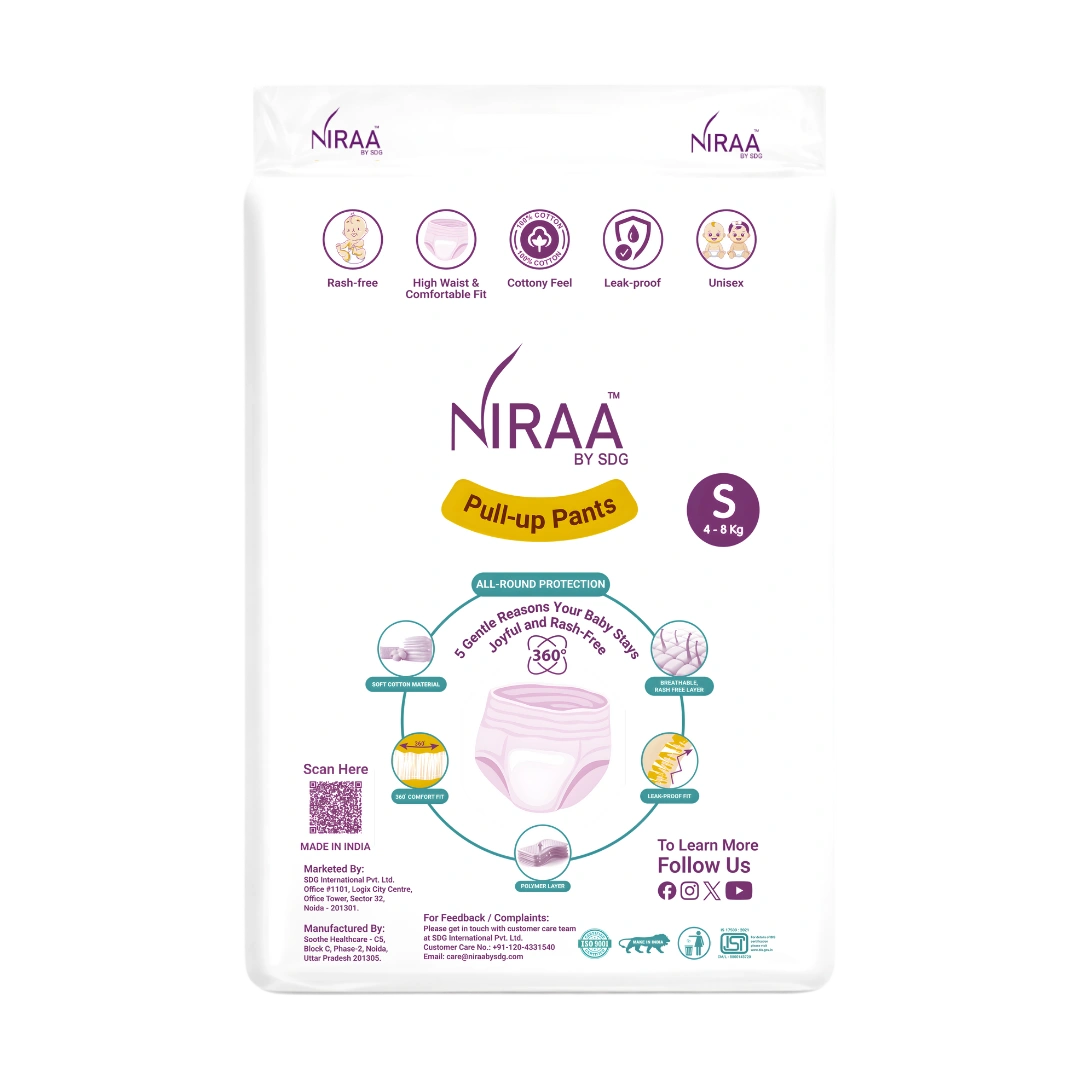 NIRAA Baby Diaper Pull-Up Pants Size S are specially designed to keep your baby dry, comfortable, and happy throughout the day and night. Made for growing babies, these pant-style diapers offer a secure fit, easy wear, and reliable protection for daily use.